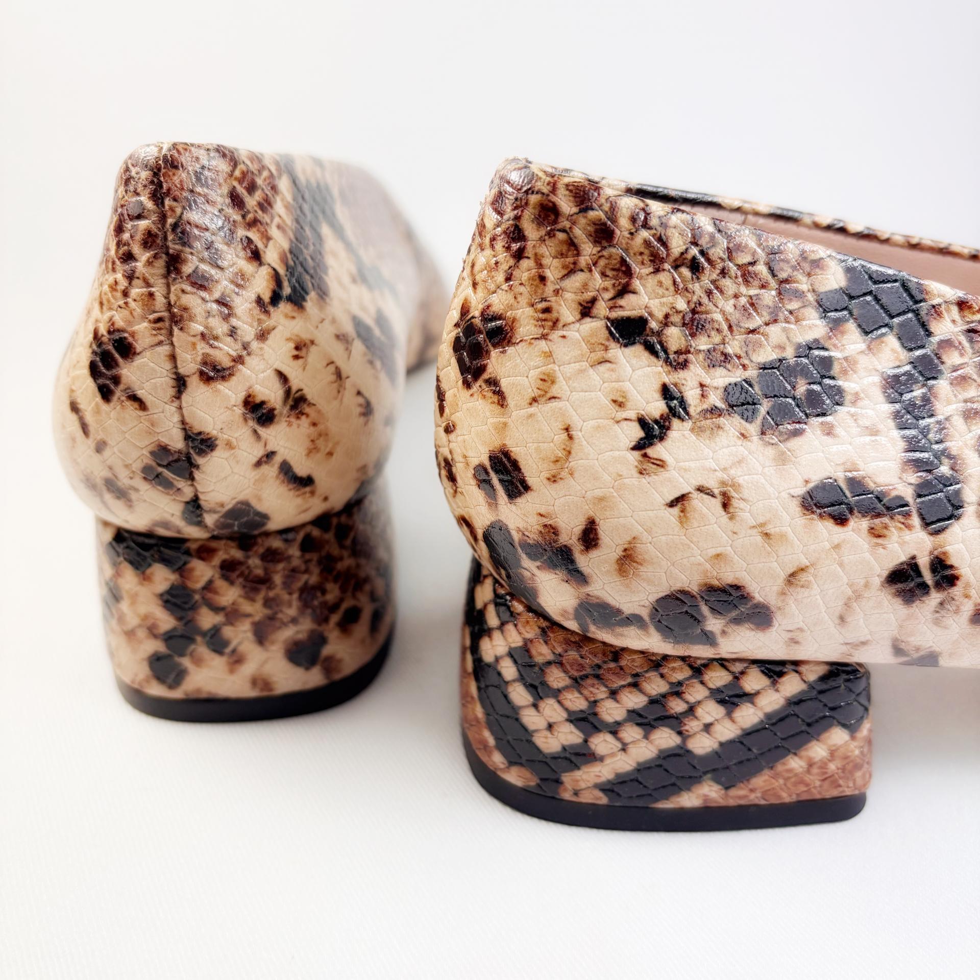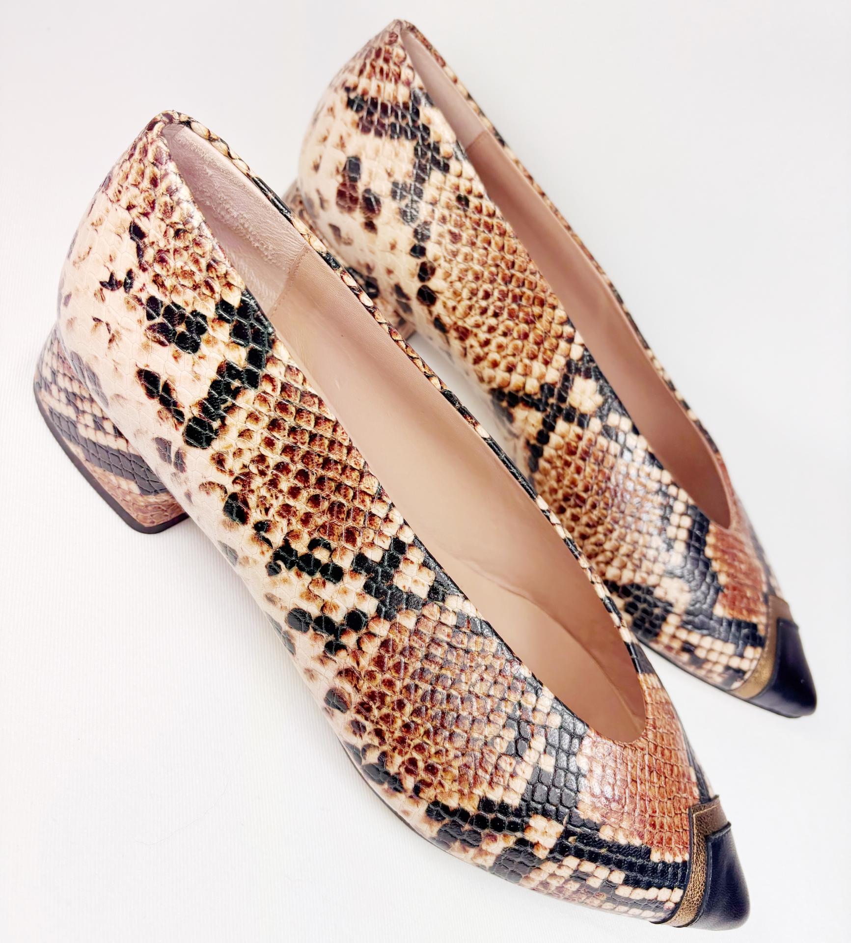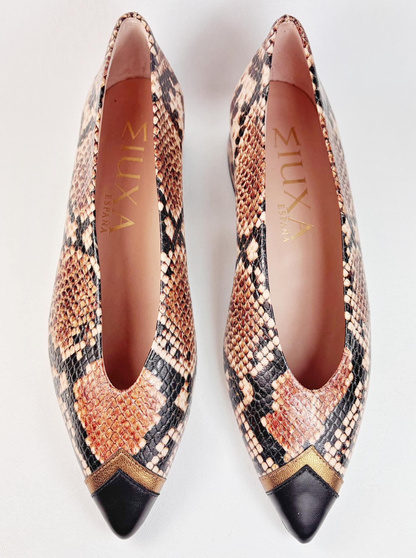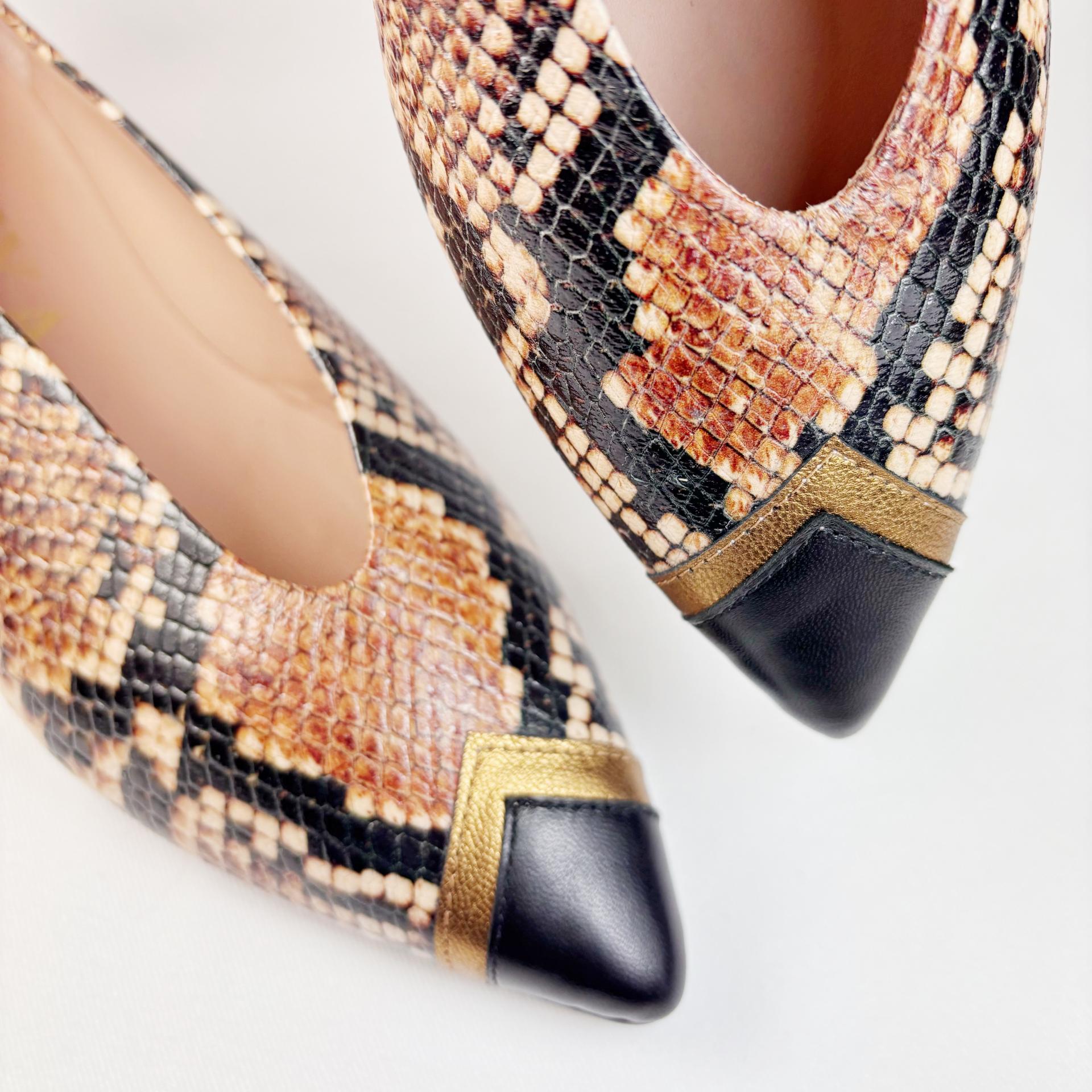 BAILARINA ESCOTE EN V EN PRINT SERPIENTE CON PUNTERA EN OROY NEGRO.