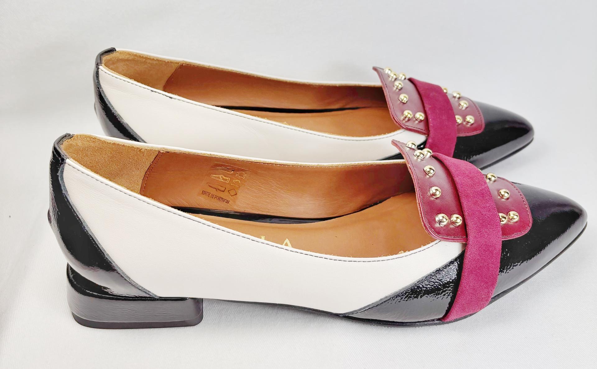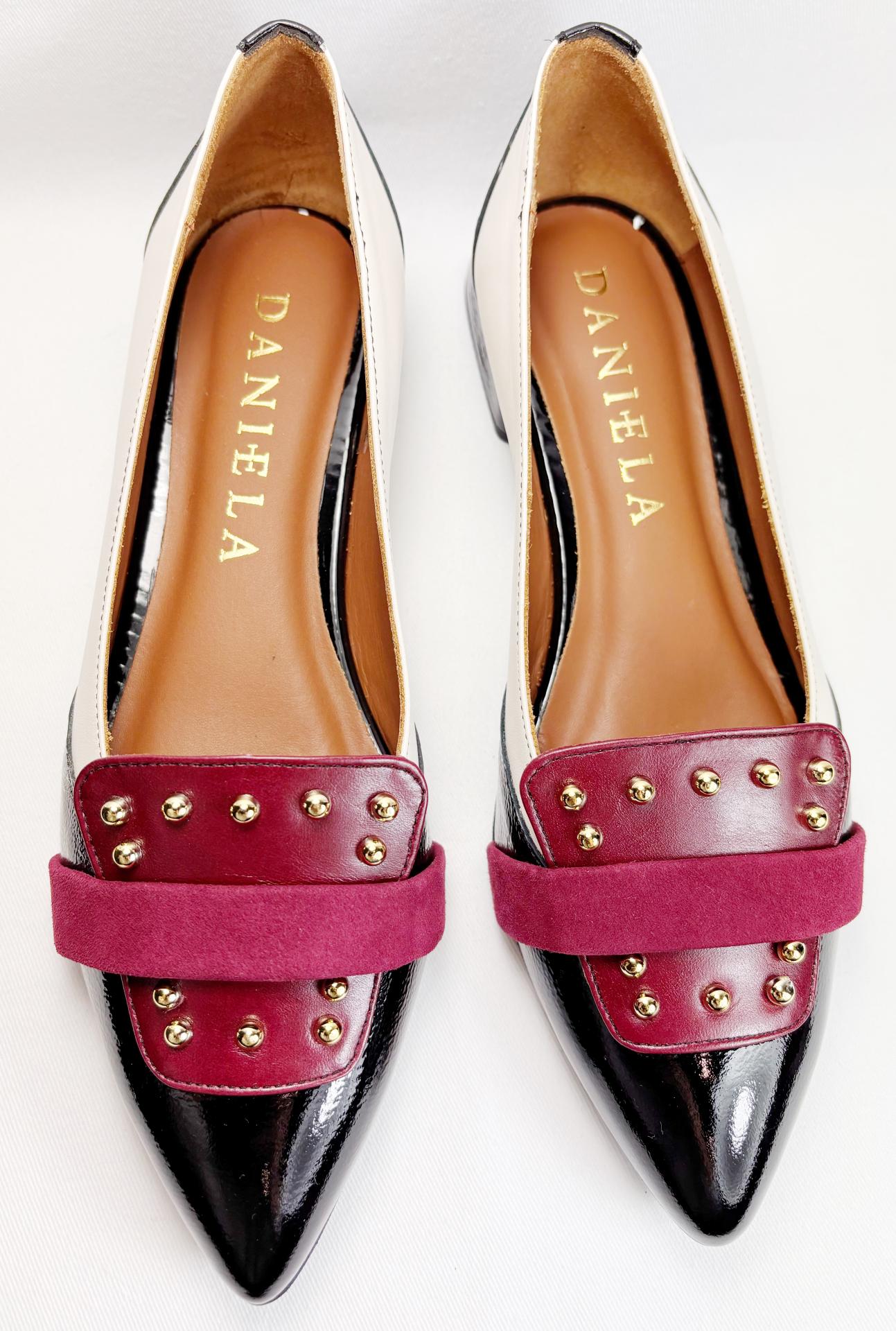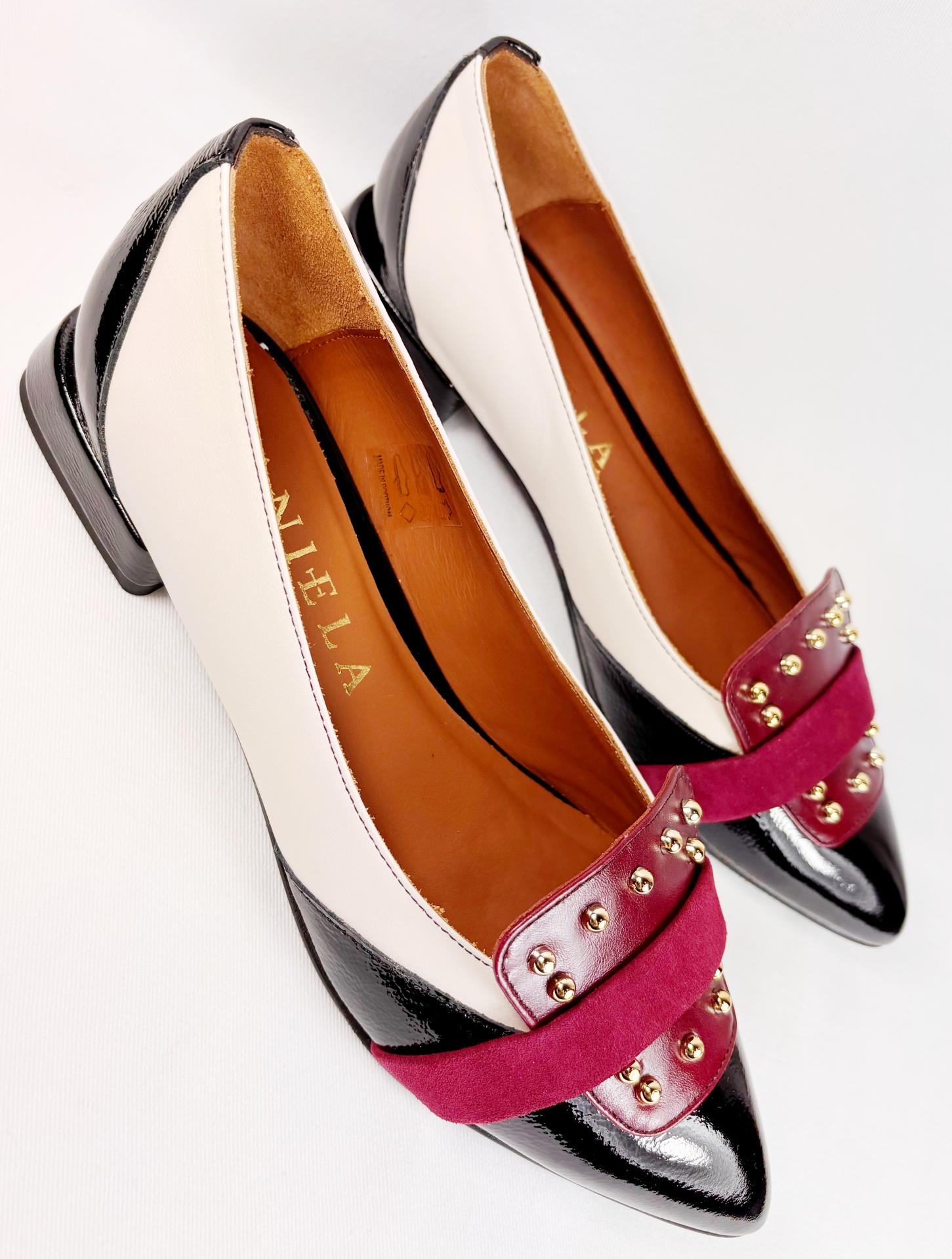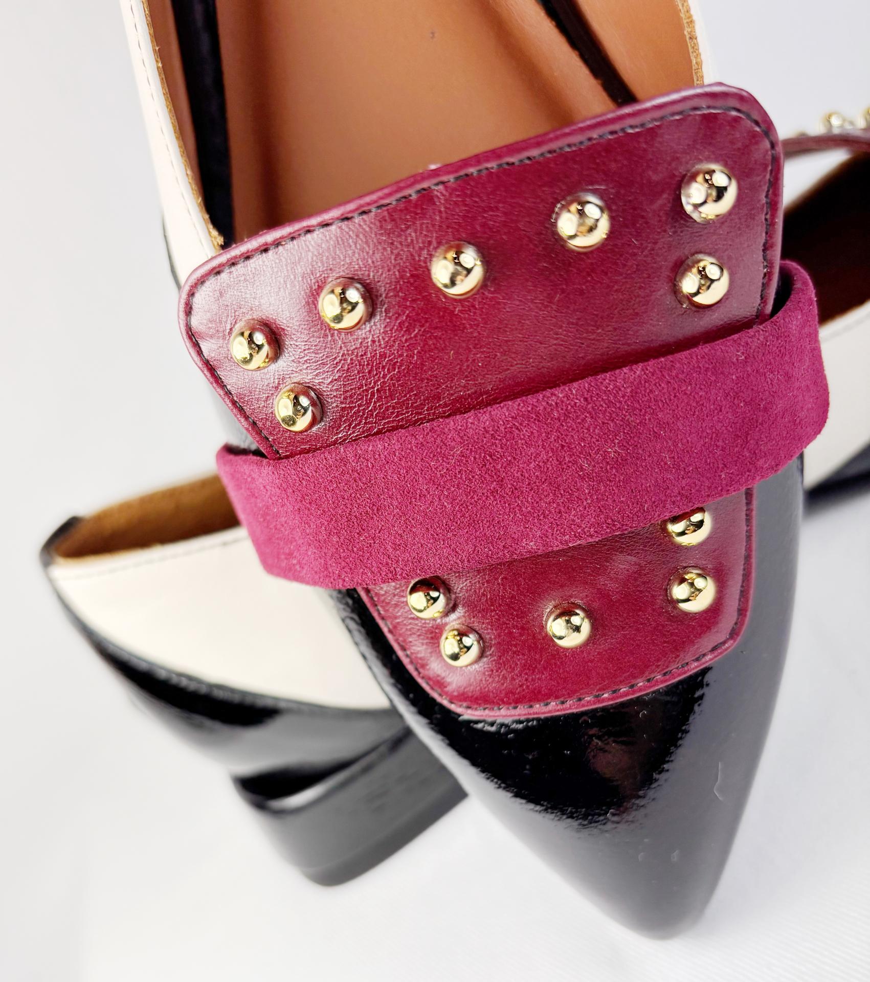 BAILARINA COMBINADA EN CRUDO Y NEGRO CON TACHAS Y DETALLE BURDEOS.
