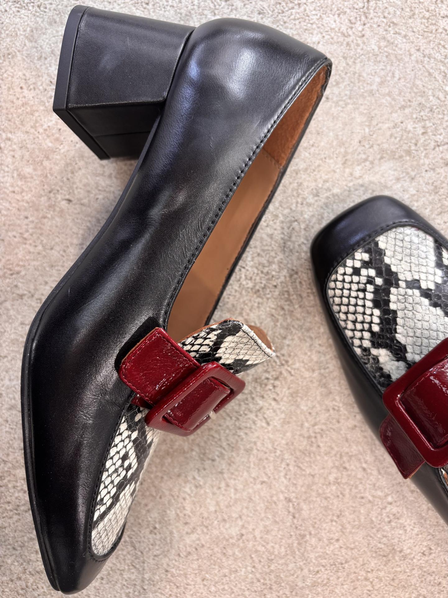 MOCASÍN NEGRO CON PRINT Y PASADO EN CHAROL CEREZA