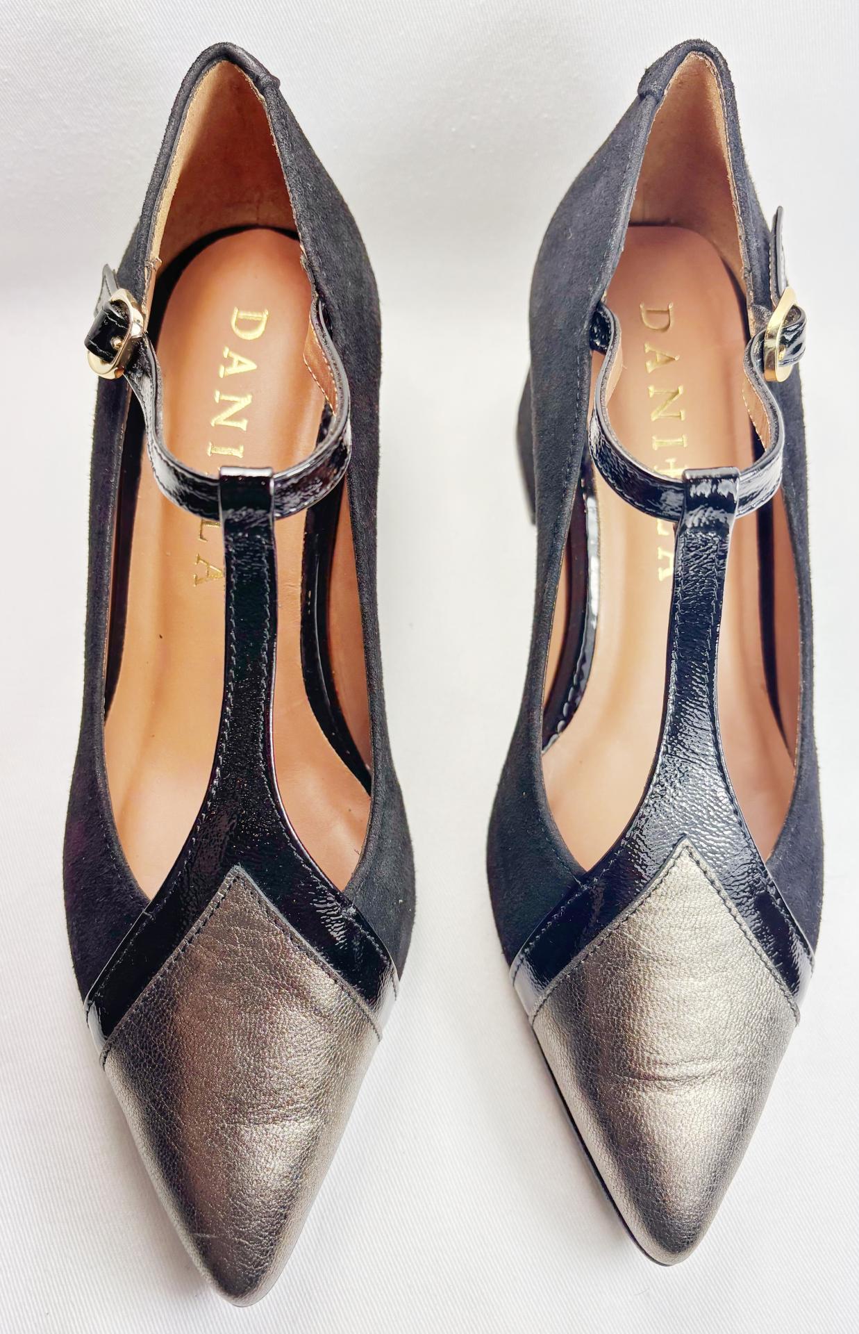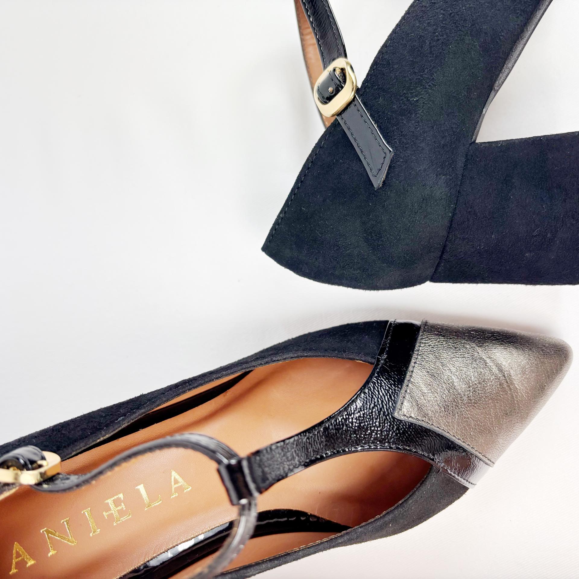 ZAPATO ANTE NEGRO CON T EN CHAROL NEGRO Y PUNTERA METAL.
