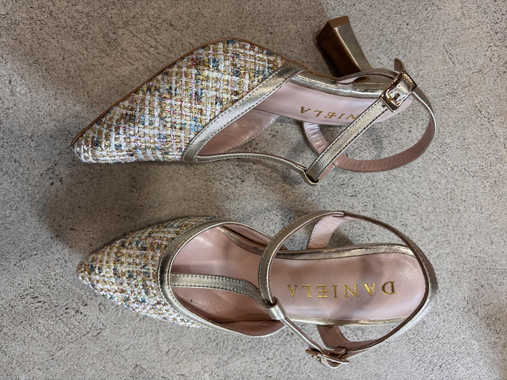SALON DESTALONADO EN TWEED DE BASE BEIGE Y DORADA.