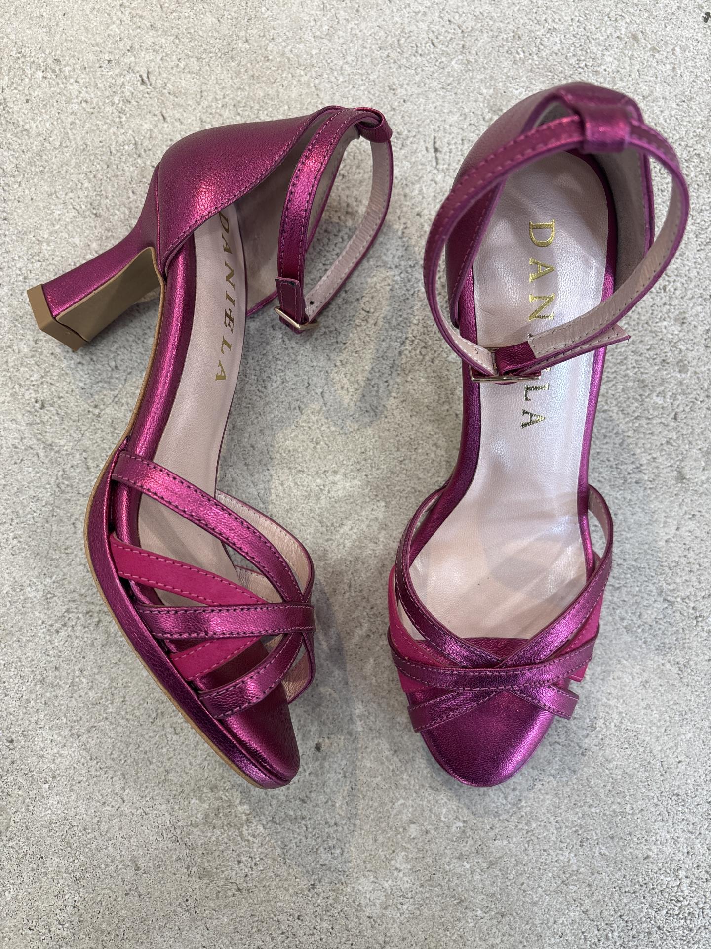 REALIZADA EN PIEL BRILLO FUXIA Y ANTE FUXIA AL TONO.