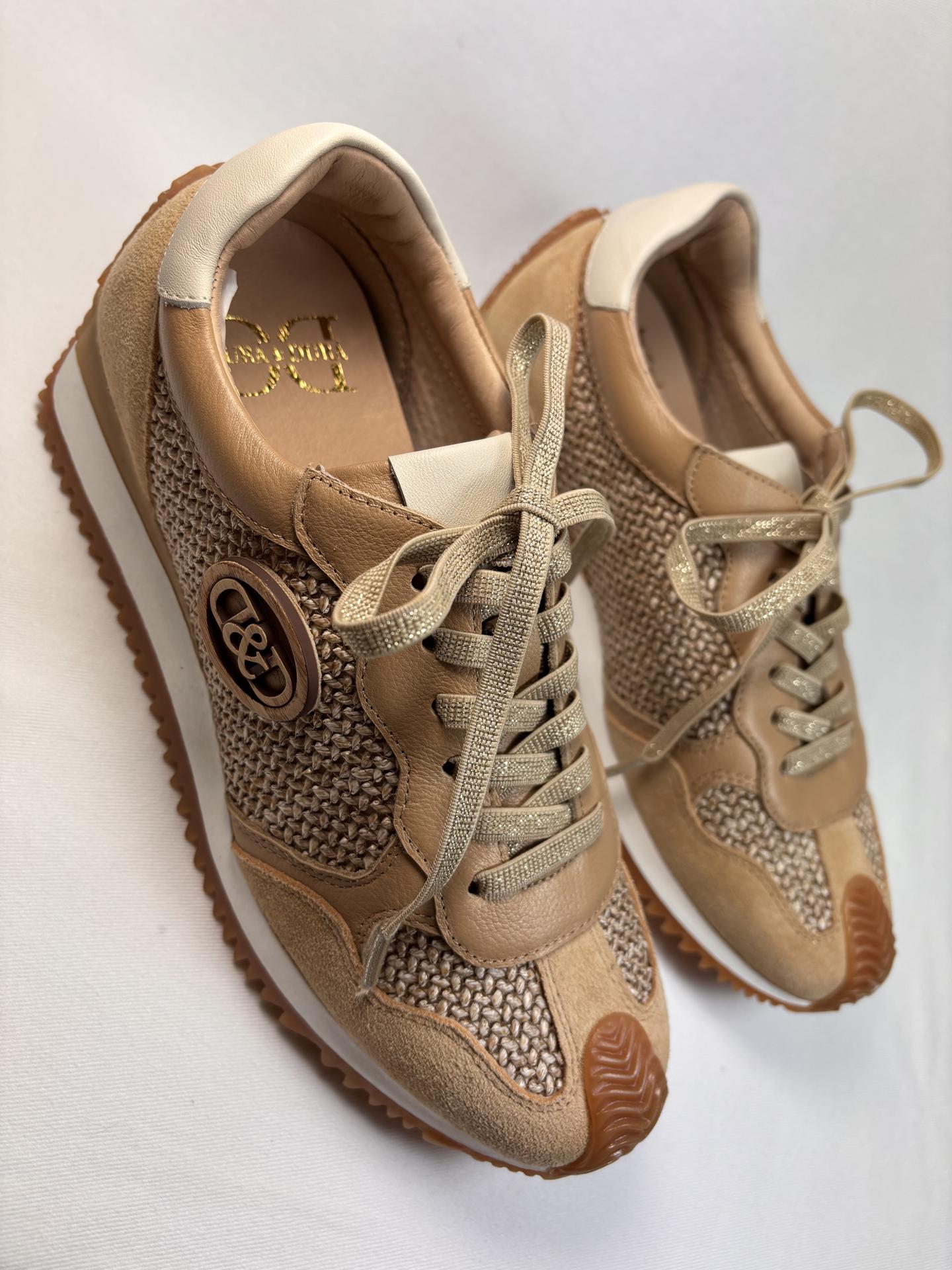 DEPORTIVO EN PIEL Y ANTE TONO CAMEL, CON RAFIA TEJIDA Y CORDON ELASTICO BEIGE ORO.