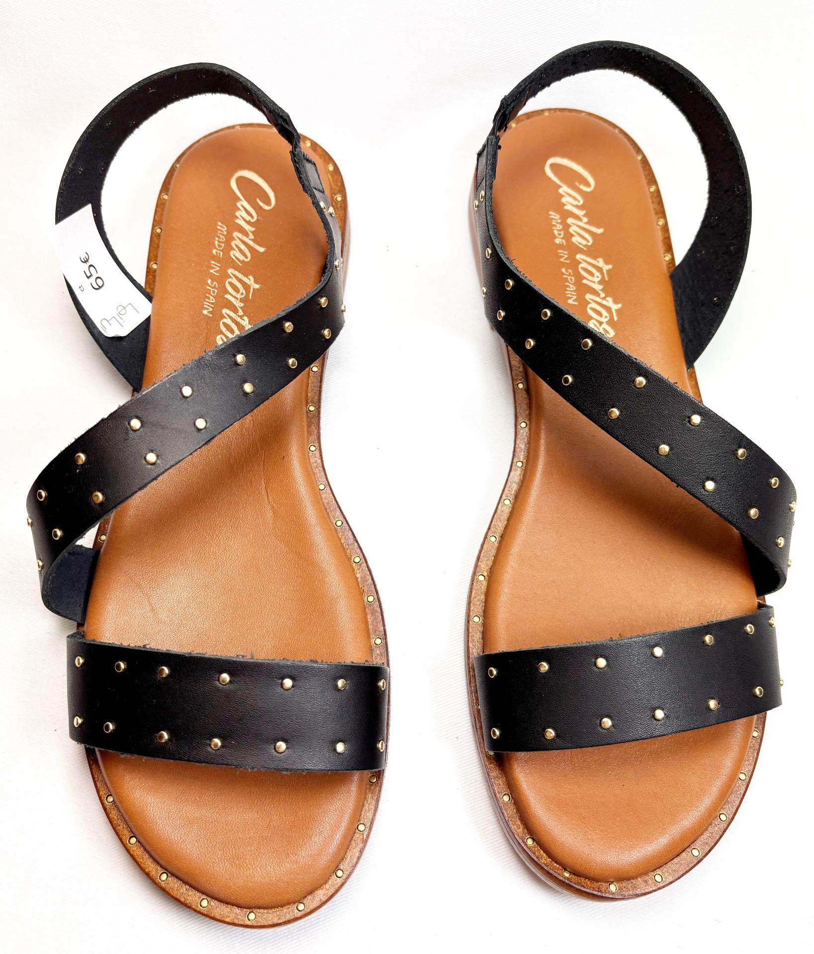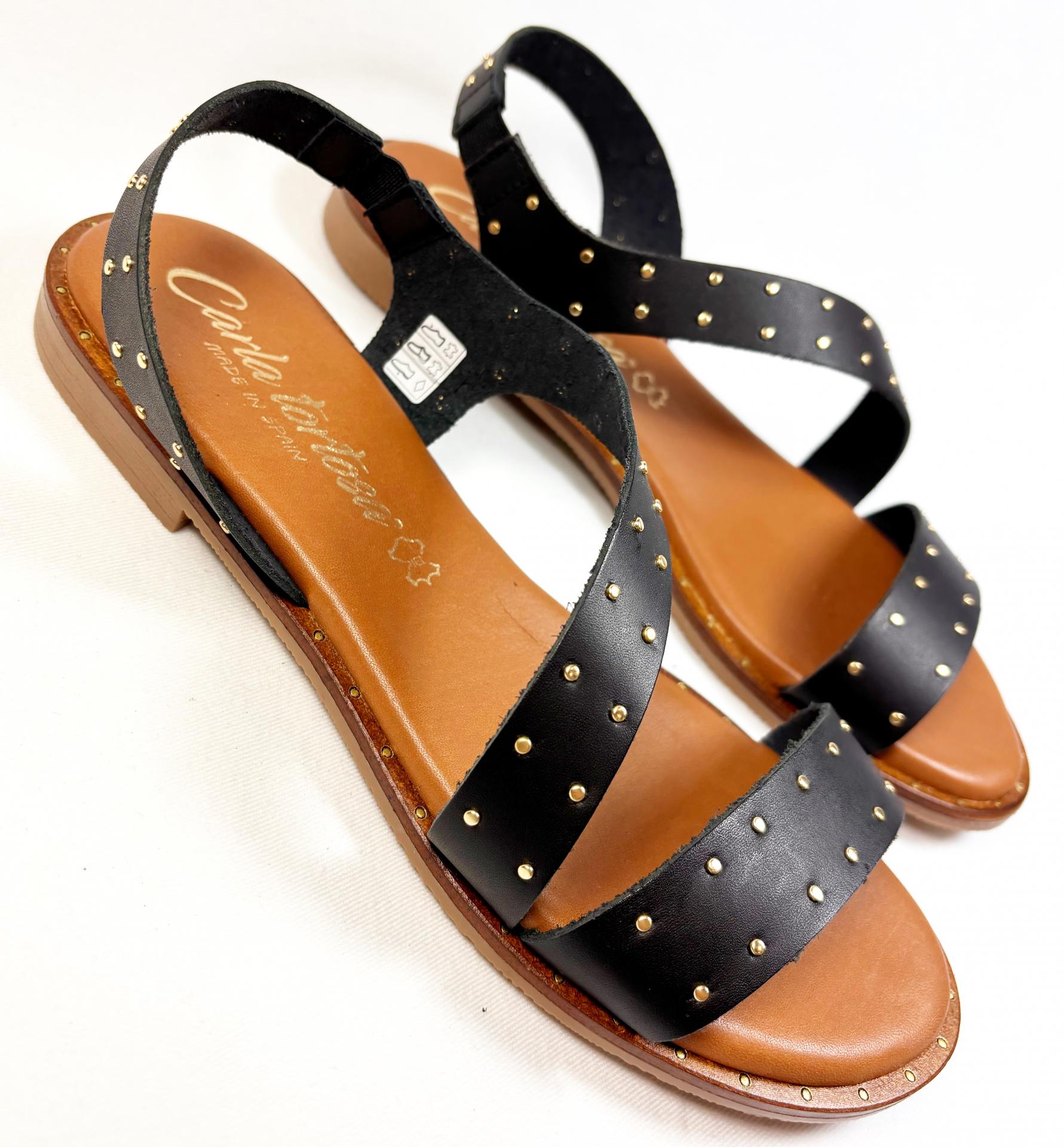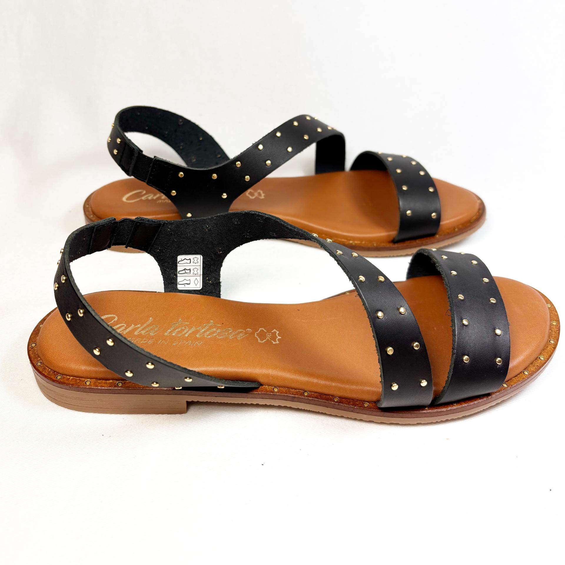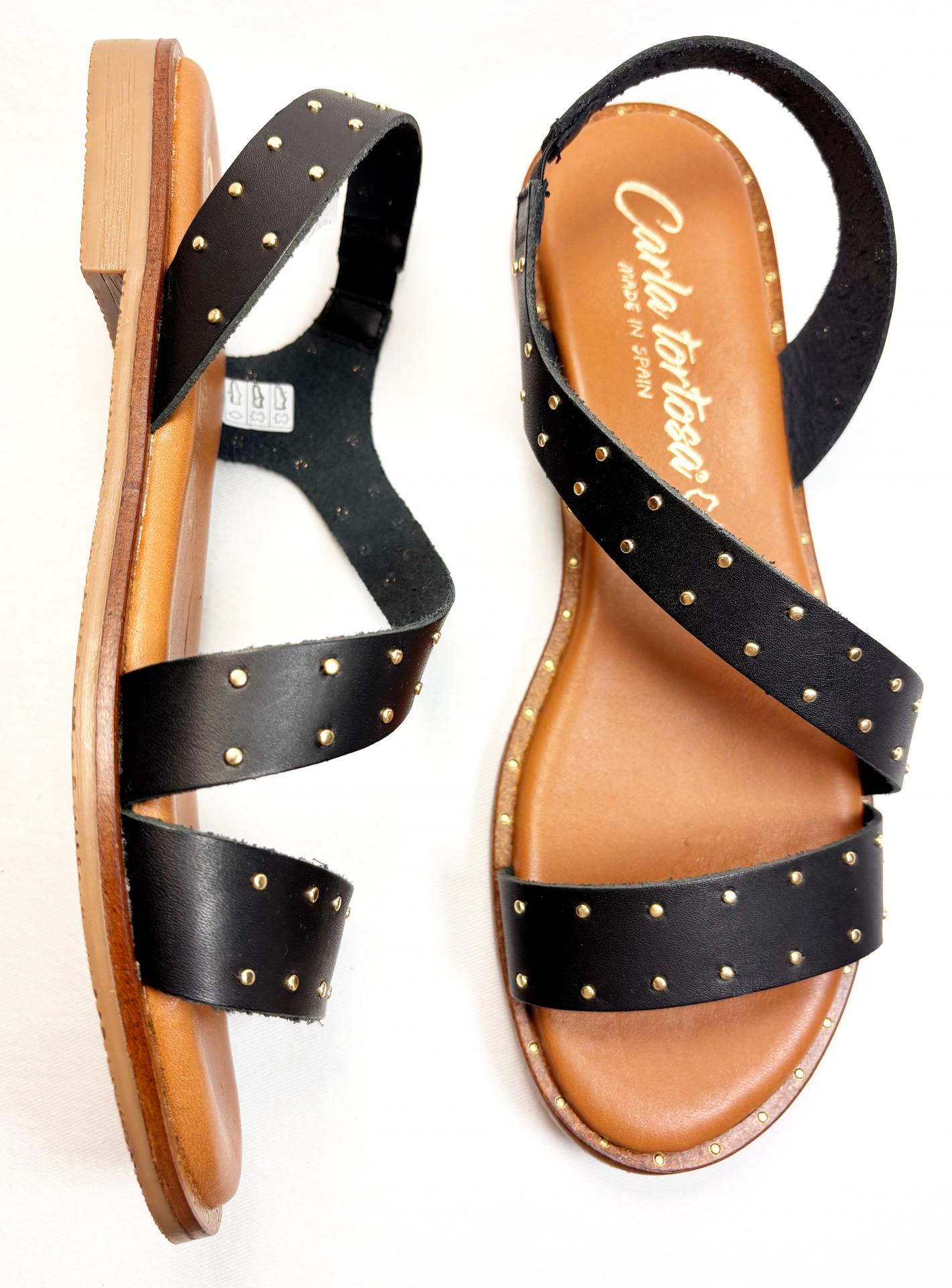 SANDALIA DE TIRAS PLANA EN NAPA BLANDA NEGRA CON TACHITAS DORADAS.